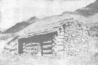 Built about 1830, this picturesque ruin still stands on the Albert Morgan ranch on the Imnaha. It was on the place when Mr. Morgan bought the homestead relinquishment of William Himelwright in 1888. A year or two before that, two families spent the winter under the shelter of the old cabin. Mr. Morgan occupied it in his bachelor days, but built a real house after he married. |