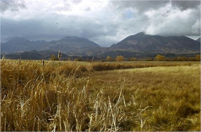 | Looking up towards Anthony Lakes area, Cattle grazing on Anthony drainage Nov 1975 |