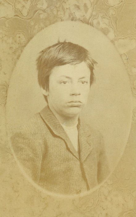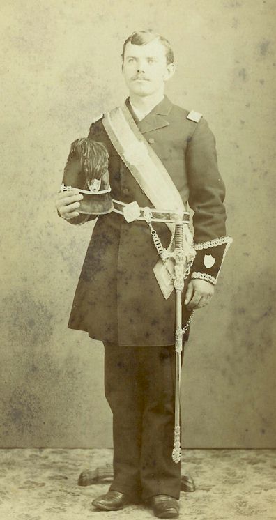 Identified in ink, in a fine hand on the back as "W. L Finch 1885." In the 1880 census for Baker City, there was a family consisting of William Fraker, 53, Carpenter from Missouri. His wife is Eliza F. Fraker and she is 36, also from Missouri. They have 2 sons and 2 daughters, all b. in Oregon - ages ranging from 14 down to 4, meaning they came from Missouri a bit more than 14 years before 1880 - or about 1865 +/-. In the household also are William Finch 18, and Margaret Finch 16 (both older than the Fraker children). They are stepson and stepdaughter, meaning they are Eliza Fraker's children from an earlier marriage to a Finch - and they were born in Missouri-so the move to Oregon was likely between 1862+ and 1865. Maybe someone there can figure out the meaning of the elaborate uniform of young Finch. If I have him pegged correctly in the census, he is 23 at the time of the photo. |