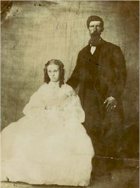 The photo on the back is titled "Aunt Sarah Cleaver and husband", and in a different handwriting. In faint pencil across the end of the ink writing is "taken about 70." The bride Sarah appears to be very young, a late teen or early 20's at latest. That means this Sarah was born close to 1850. In the 1870 census for Oregon, there are 2 Sarah M. Cleavers. The one in Baker City is 31 and married to Joseph W. Cleaver, who is a Hotel Keeper. The other is in Union, Grant Co and married to J. F. Cleaver, a butcher. She is 20; if the photo is dated correctly, I vote for this Sarah as the one in the photo. This couple had a son named Arthur, age 1 in 1870. This information was determined by Marvin Houseworth, from his collection. Note: Janice Buchanan, 2nd great grand niece of Joseph Wraith Cleaver believes this to be Sarah Melissa Peters married to Joseph Wraith Cleaver. Census records have them residing in Baker City, Baker County, in 1870, 1880, and 1900. After Joseph died his widow Sarah resided in Portland until her death. J. (James F. Cleaver and wife Sarah M. never resided in Baker County in 1870 and 1880, they were in Union, Grant County, in 1900 census Sarah is a widow residing in Baker Baker County on Center Street. Webmasters questions: From research I have done, Union was never in Grant County (Early 1860s prompted the Legislative Assembly to split Umatilla and Baker Counties from Wasco County on September 22, 1862. Further development of the Grande Ronde Valley led to calls for the legislature to split Union County from Baker County. This finally occurred on October 14, 1864. Union County's name reflects the support of the people in this area toward maintaining the United States during the Civil War. Between 1875 and 1913, adjustments were made to Union County's borders with Baker, Umatilla, and Wallowa Counties. Union County, lying between the Blue and Wallowa Mountains, is bordered by Wallowa County on the east and north, Umatilla County on the west, and Grant and Baker Counties on the south. Oregon Blue Book) Did both families have a son Arthur who was age 1 in 1870. I leave these questions to be answered by Cleaver researchers, and if it is determined who the people in the photograph are, I would appreciate the information to add to the page. |