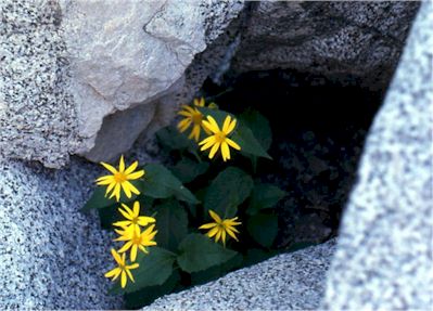 Yellow wild flowers framed in granite high up in the Wallowa Mountains |