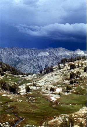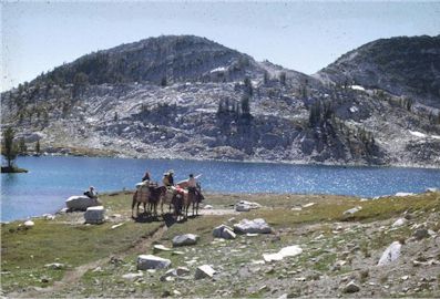Charlie Haight and I were spending a few days in the Eagle Cap Wilderness Mountains and were taking a break here at Glacier Lake when these hunters rode up on us. Turned out to be a group led by Ron Berquist from Baker (the gent who started the restaurant chain Shari's for an elderly woman who backed him). Anyway Ron had clients with him and they stopped and chatted for awhile and as they were about to leave Ron (pointing in the photo) went into the packed equipment took out a full venison backstrap and gave it to us then they went on their way. |
