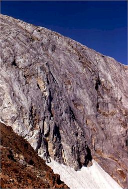 Below top of the Eagle Cap Wilderness mountain 'The Matterhorn' looking up the east side. On very crest just left of center a lone hiker/climber. Wallowa County (you can see a little white dot) |